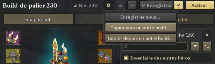 Si l’item qui vous intéresse est dans un sac d’un Héros groupé, il est possible de l’équiper directement sans avoir à le changer d’inventaire au préalable. Il est également possible d’importer ou d’exporter un équipement entier depuis/vers une autre page de build.