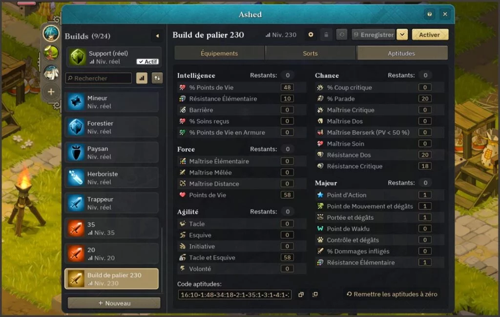 Là encore, il est possible d’importer/exporter votre répartition de points d’aptitudes via le bouton en haut à droite de l’interface.