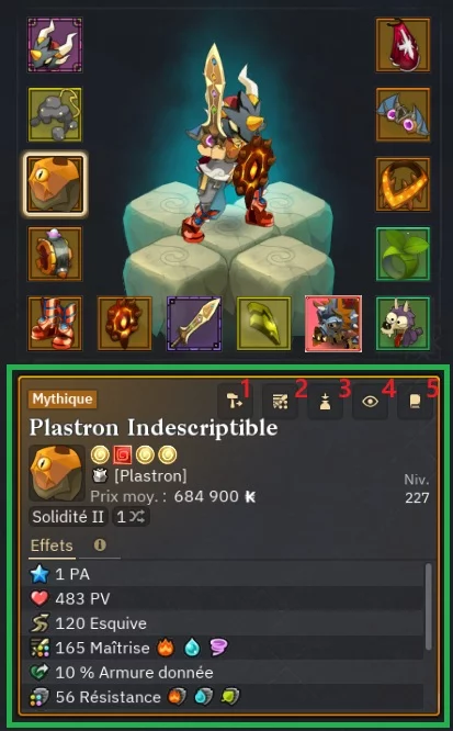 - 4 : Prévisualise l’objet (plus utile sur un item que vous voyez à l’HDV, par exemple)
