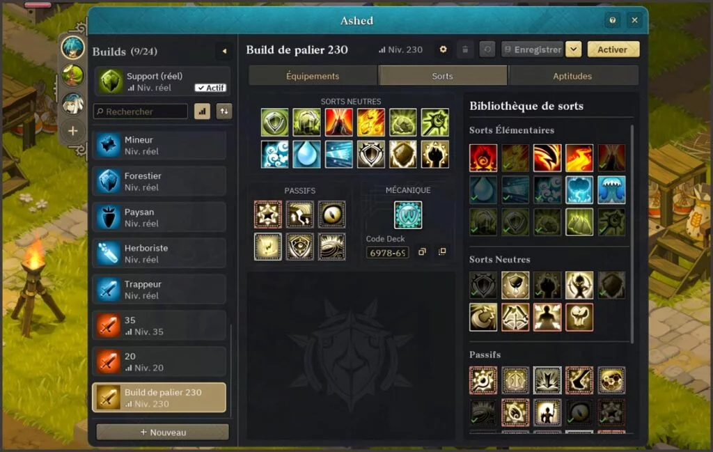 Comme pour les équipements, il est possible d’importer/exporter un deck de sorts/passifs en utilisant le bouton en haut à droite mais il est aussi possible ici de copier/coller le « Code Deck » pour partager plus facilement votre choix de sorts/passifs à d’autres joueurs.
