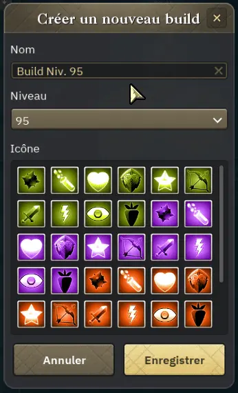 Afin d’en créer un nouveau, cliquez sur le bouton « + Nouveau » pour ouvrir le menu de création de build. Vous pourrez y choisir un nom pour votre build ainsi que la tranche de niveau ainsi que l’icône associé.