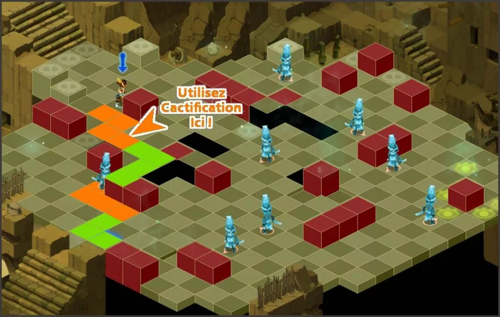 La map a visiblement subit une modification depuis notre screen. Il n’y avait pas les glyphes morts avant mais il est possible de les traverser en étant transformé en cacterre. Le chemin indiqué sur le screen actuel semble toujours fonctionner à 100% en se cactifiant comme indiqué. On va ajouter des précisions sur ces combats, merci pour le retour !