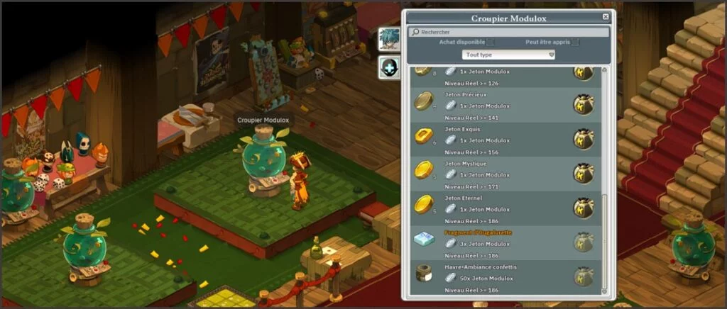 - Ces jetons modulox sont échangeables au croupier Modulox, dans le sous-sol de la taverne d’Astrub, contre d’autres jetons, de tout niveau, ou contre des fragments d’Ougalurette, une relique lvl 185.